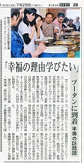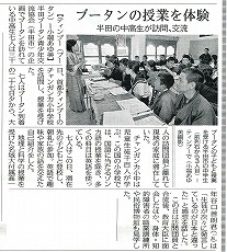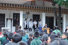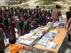 『校長先生からは「広い図書室はあるけども本が無くて困っていた。半田ブータン青少年交流協会には心からお礼を言いたい。」と感謝を述べられ、教育委員長は「寄贈された本はバラエティーに富んでおり、小さいクラスから大きなクラスまでみんなが読め、また先生達も参考書として使える。ここの学校は大きな恩恵を受けた。皆も寄贈された本を大切にするように。」と生徒達に呼びかけた。』
