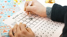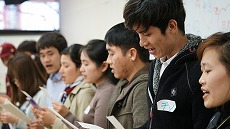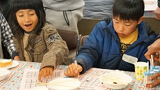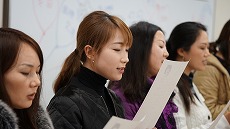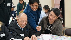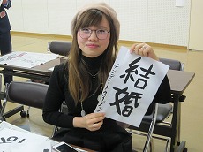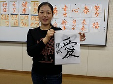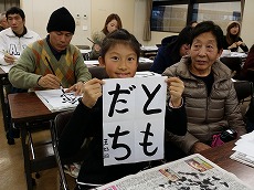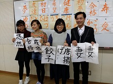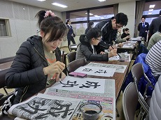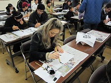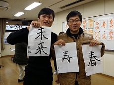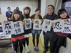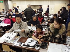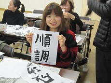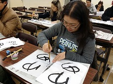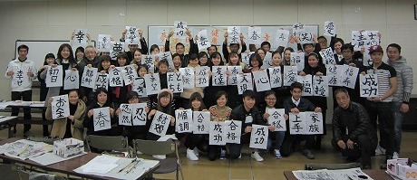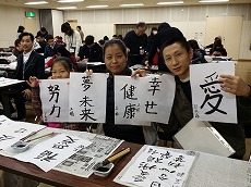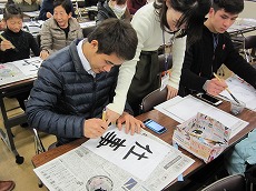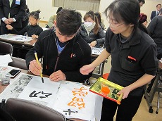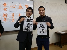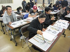 新年最初の日本語教室では、書初めを行いました。約40人の生徒が、先生に教えてもらいながら、慣れない筆で抱負や夢、好きな漢字などを一生懸命書きました。