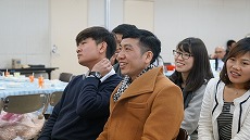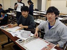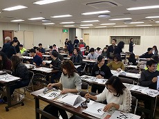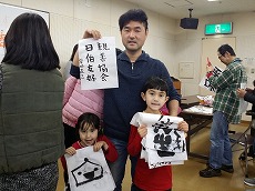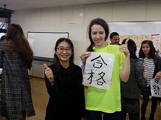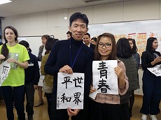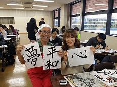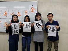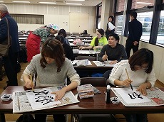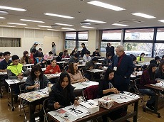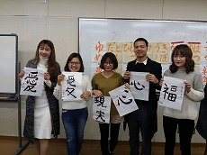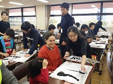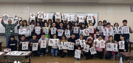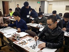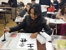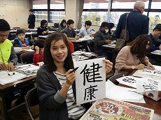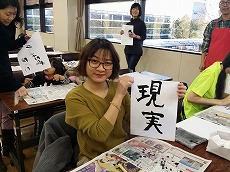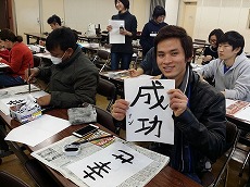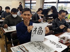 新年最初の日本語教室で書初めを行いました。35名の生徒が参加し、慣れない筆で「合格」や「平和」など、抱負や夢を一生懸命書きました。