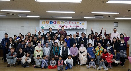 第15回インターナショナル・ポトラックパーティーを開催しました。6カ国からの外国人34名と日本人32名の計66名が、それぞれお国の料理を持ち寄って集まり、ゲームや歌を通して交流しました。