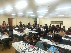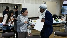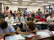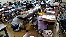 日本語教室で、防災勉強会を行いました。災害の前に備えておくもの、地震が起きたらどうするかなどの基本的なことを学びました。また、机の下にもぐる訓練も行いました。