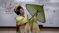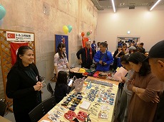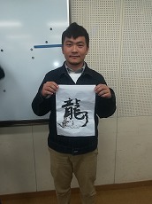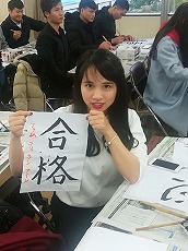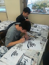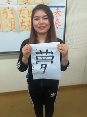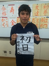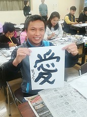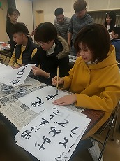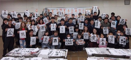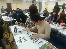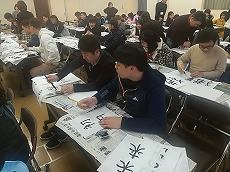 新年最初の日本語教室では、書初めを行いました。42名の生徒が参加し、先生に教えてもらいながら、思い思いの言葉を慣れない筆で一生懸命書きました。