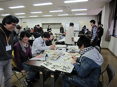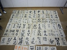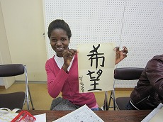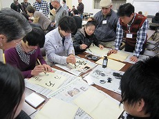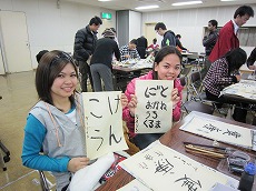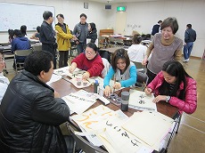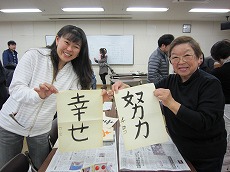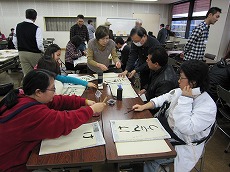日本語教室で書初め大会開催。はじめて筆を握った外国人は、『思うように書けないなあ〜』と、何度も何度も挑戦していました。